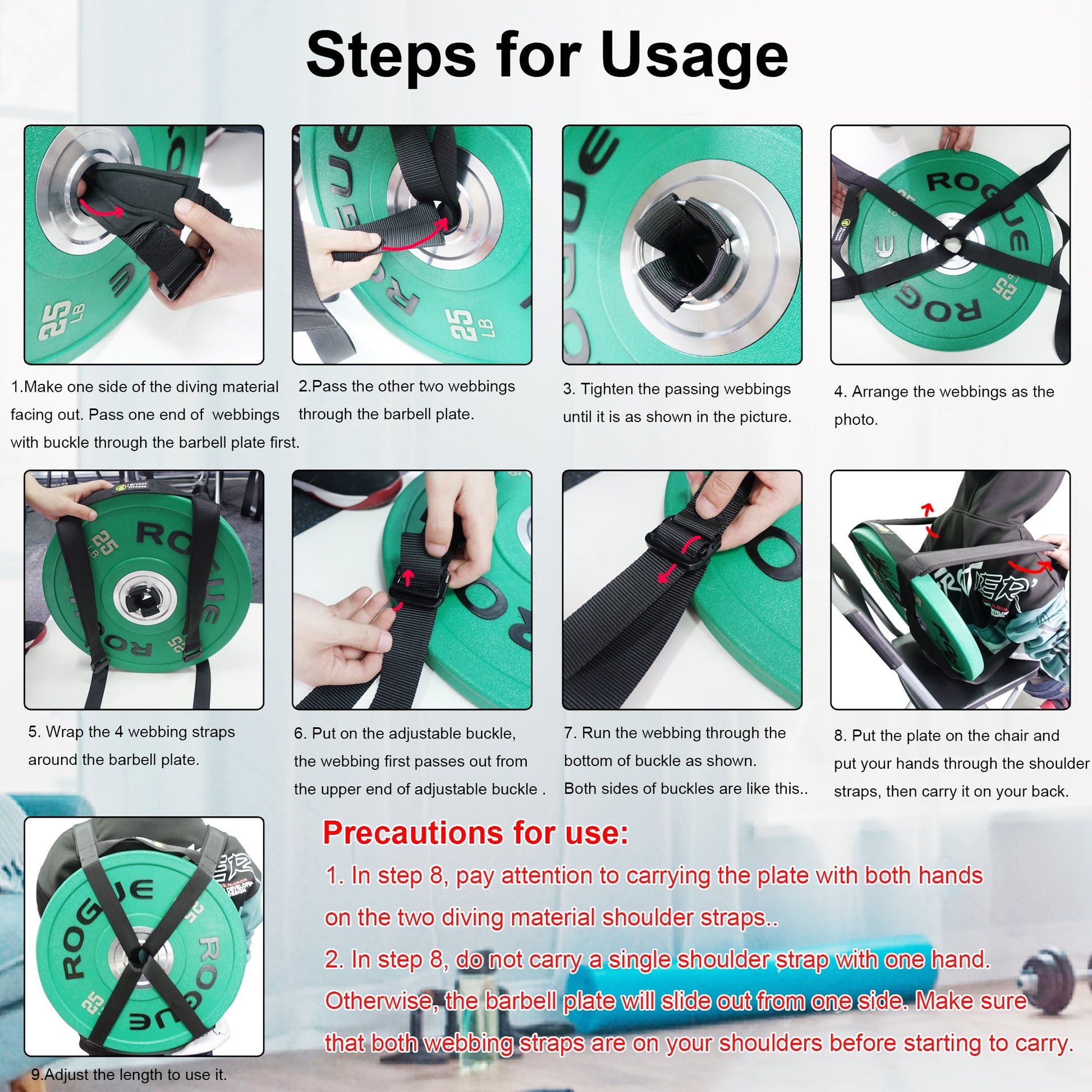 2. Firm and durable: Made of high-strength webbing, with a large stainless steel ring to prevent the barbell from slipping out.